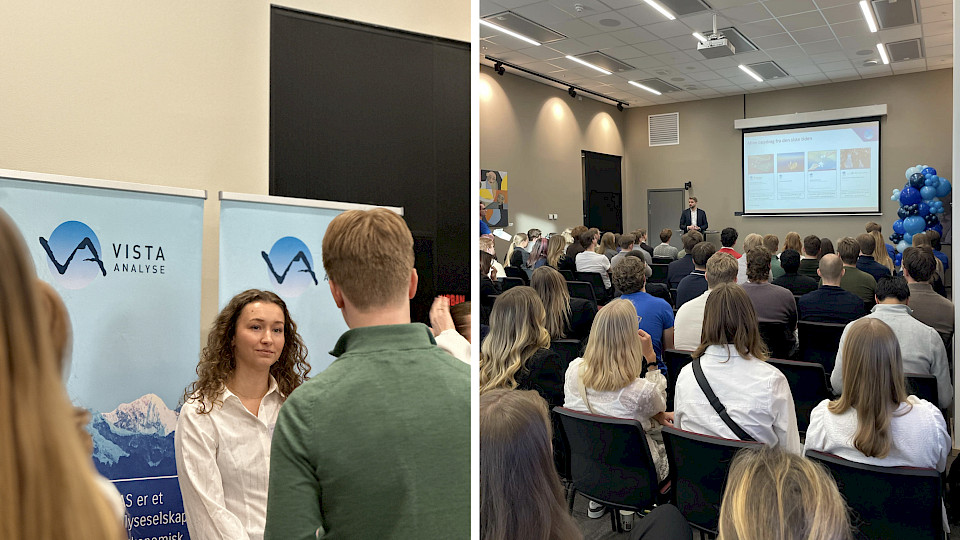 På vår stand fortalte vi om arbeidshverdagen i Vista Analyse, våre prosjekter og hvordan vi bruker samfunnsøkonomisk analyse til å løse samfunnsaktuelle problemstillinger. I tillegg holdt vi en bedriftspresentasjon, og vi gjennomførte speed-intervjuer med dyktige studenter som vurderer en karriere hos oss.
