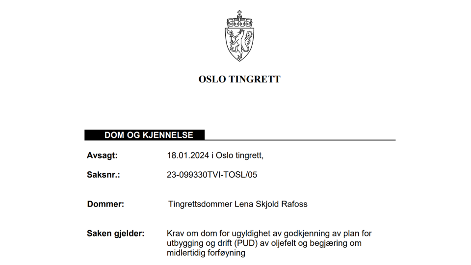 Oslo tingrett ga Greenpeace og Natur og ungdom fullt medhold i saken mot staten, ved Olje- og Energidepartementet (nå Energidepartementet). Saksøkerne brukte Vista Analyses rapport 2023/04 "Norsk olje, globale utslipp" som bevis i saken, og rapportforfatter og seniorøkonom Haakon Riekeles var tidligere i vinter i retten som sakkyndig vitne.